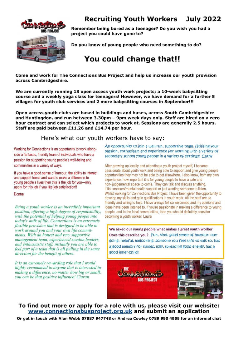 Sept 2025 update – Although our staffing is stable at the moment we welcome hearing from people who may be interested in being a youth worker with us. Sessions across Cambridgeshire including opportunity to drive the buses. Especially interested in anyone available for our earlier sessions at 4pm. Please check out our Vacancies page for more details.